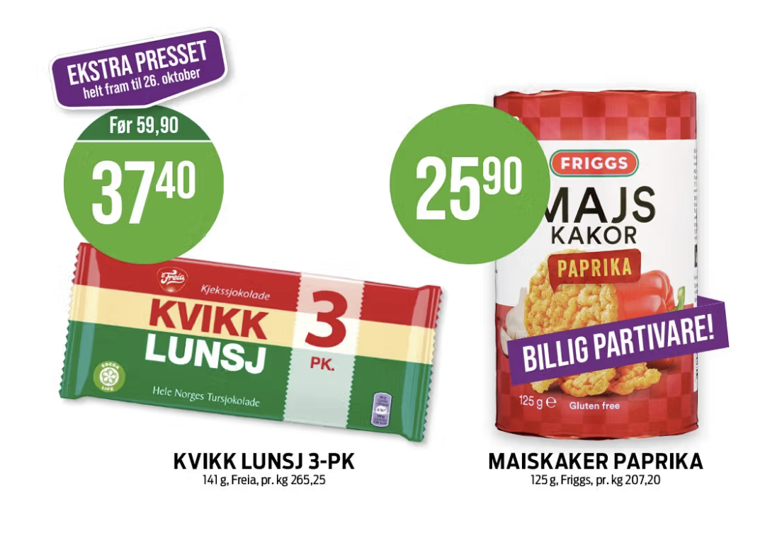 🫑 KIWI prissjekk: KIWI følger nøye med på kundeavisene og annonsene til Rema1000 og Coop Extra. Finner de en lik vare, med samme vekt og størrelse, til en lavere pris, setter de ned prisen så raskt som mulig! (unntak ved medlemstilbud/fordelsprogram, partikjøp og lokale tilbud) Lenke til prissjekk